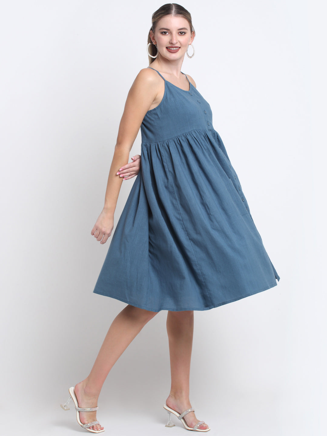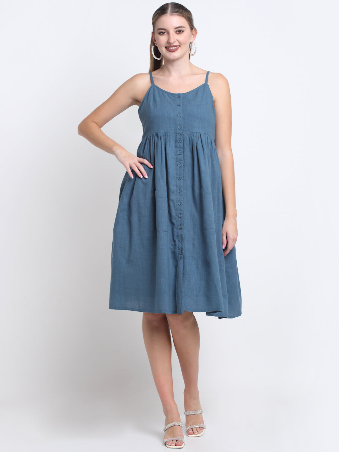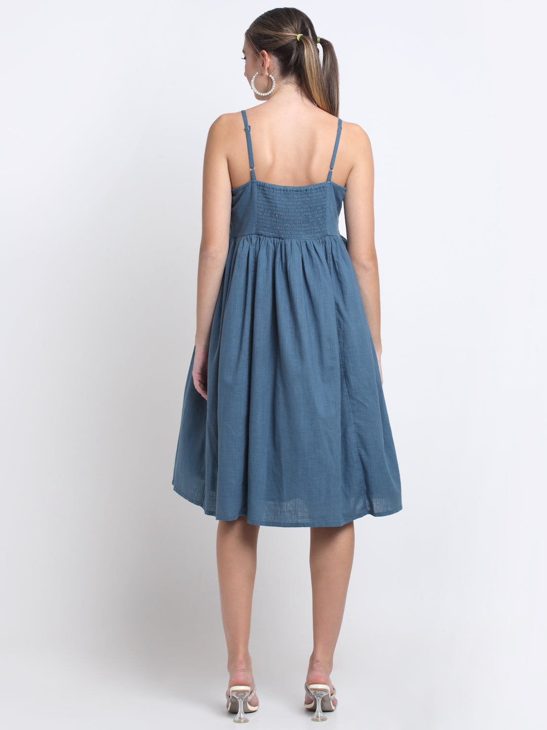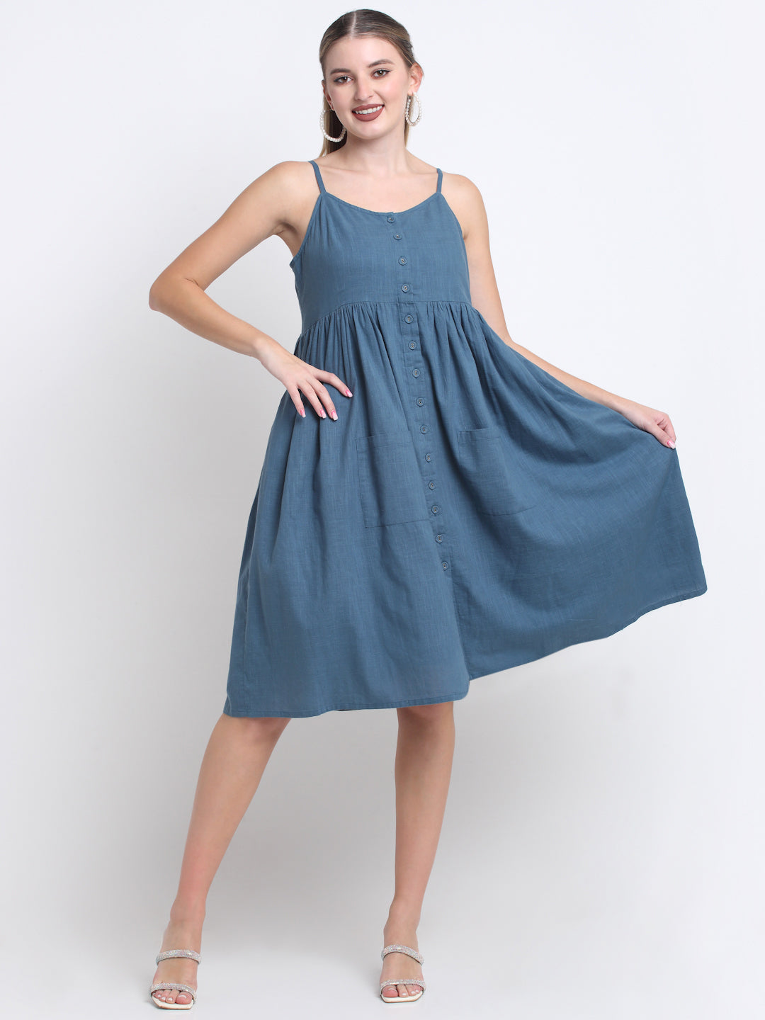 This stunning dress is a wardrobe must and is composed of soft cotton that is both breathable and comfortable to wear. It is knee-length, with a gorgeous design, a square neck with strappy sleeves, and a straight hem. This flirty flared dress is ideal for any casual event when paired with eccentric accessories, a sling bag, and elegant footwear.